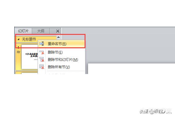 “节”是PowerPoint2010中新增的功能,主要是用来对幻灯片页进行管理的,类似于文件夹功能。使用“节”后,不仅有助于规划文稿结构;同时,编辑和维护起来也能大大节省时间。另外还能呈现出演讲者清晰的思想脉络