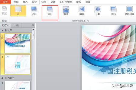 2、按住CTRL键,选中第1张,第2张幻灯片,在“切换”按钮中单击“淡出”