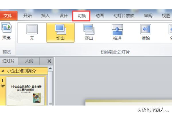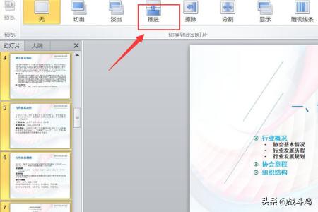 5再切换到切换选项卡,设置幻灯片切换效果。