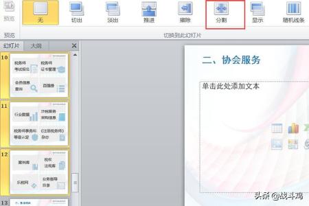 4、选中幻灯片第9-12张,单击“切换”中的“分割”按钮