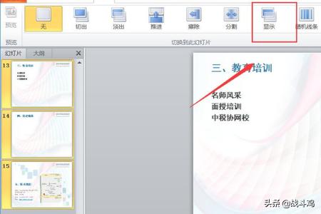 5、最后的13张,14张,15张,单击切换按钮的“显示”,四种不同的切换方式,完成!