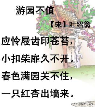 游园不值(宋)叶绍翁应/怜/屐齿/印/苍苔,小/扣/柴扉/久/不开。春色满园/关/不住,一枝红杏/出/墙来。